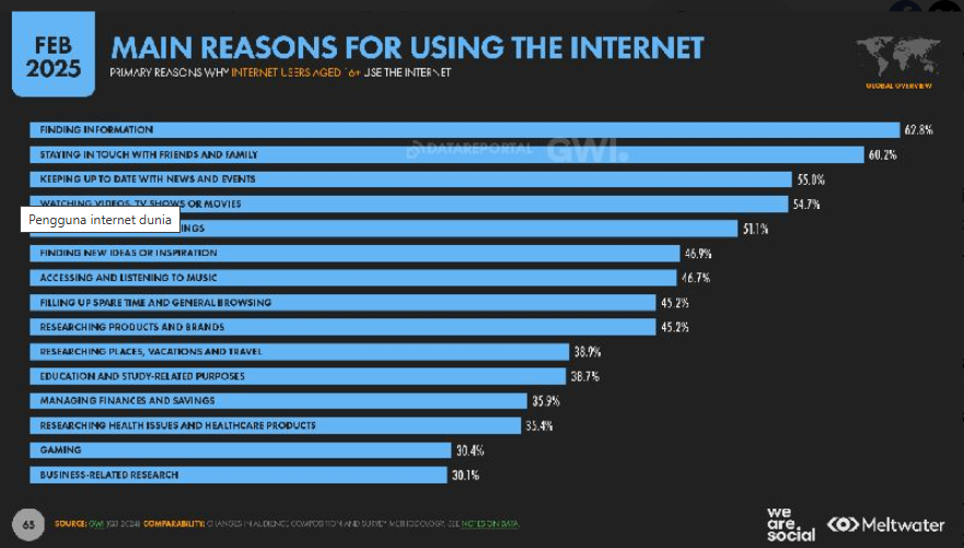 Menurut laporan tahunan We Are Social yang dirilis pada Februari 2025, jumlah pengguna internet global mencapai 5,56 miliar, atau 67,9% dari total populasi dunia yang mencapai 8,2 miliar. Angka ini menunjukkan peningkatan 136 juta pengguna internet baru dibandingkan tahun lalu, dengan pertumbuhan 2,5%. Sementara itu, pengguna seluler tercatat 5,78 miliar, yang berarti 70,55% dari populasi dunia mengakses internet melalui ponsel.
